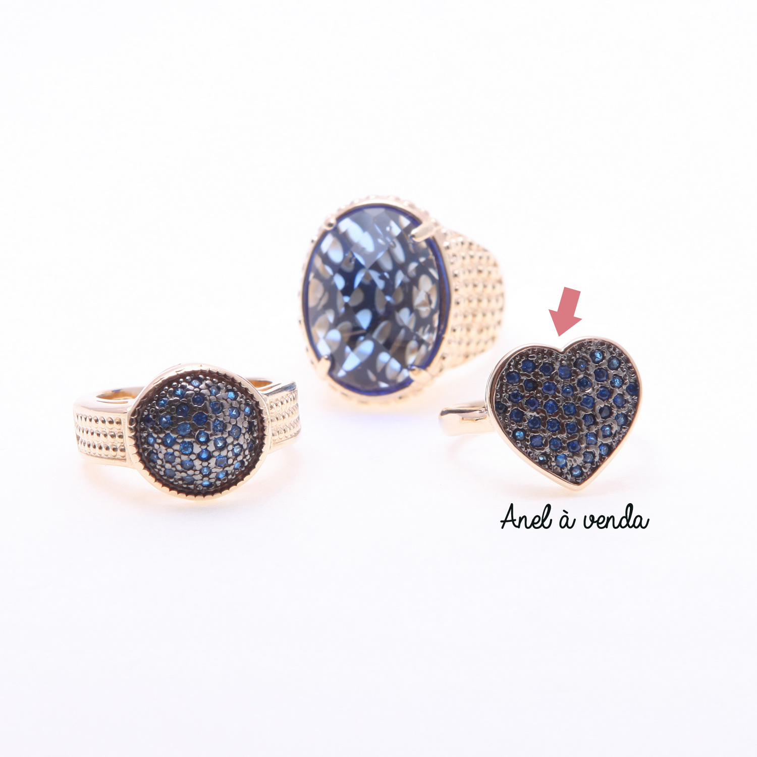 Anel coração em (semijoia) banhado a ouro com micro zircônias azuis. Utilize imediatamente o medidor de anéis.