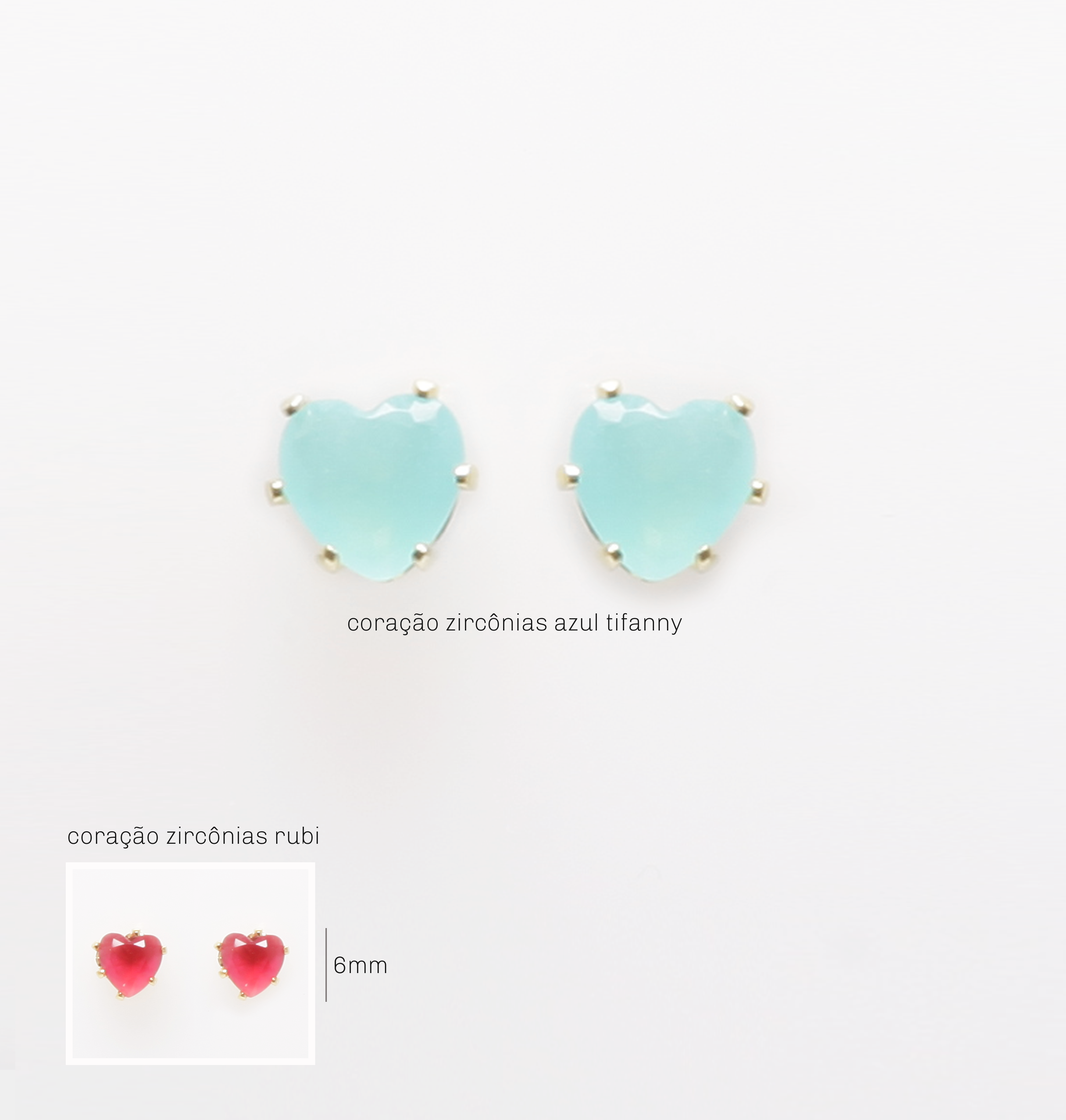 Brincos de pinos banhados a ouro de coração 06mm com zircônias na coloração azul tifanny ou rubi. Um MIMO!!!