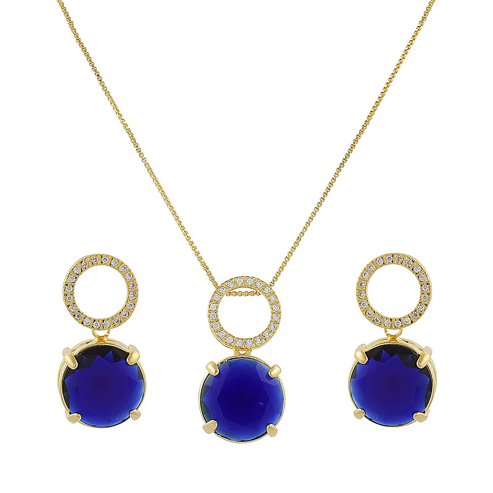 Conjunto colar + brinco em zircônia e pedras naturais banhado a ouro