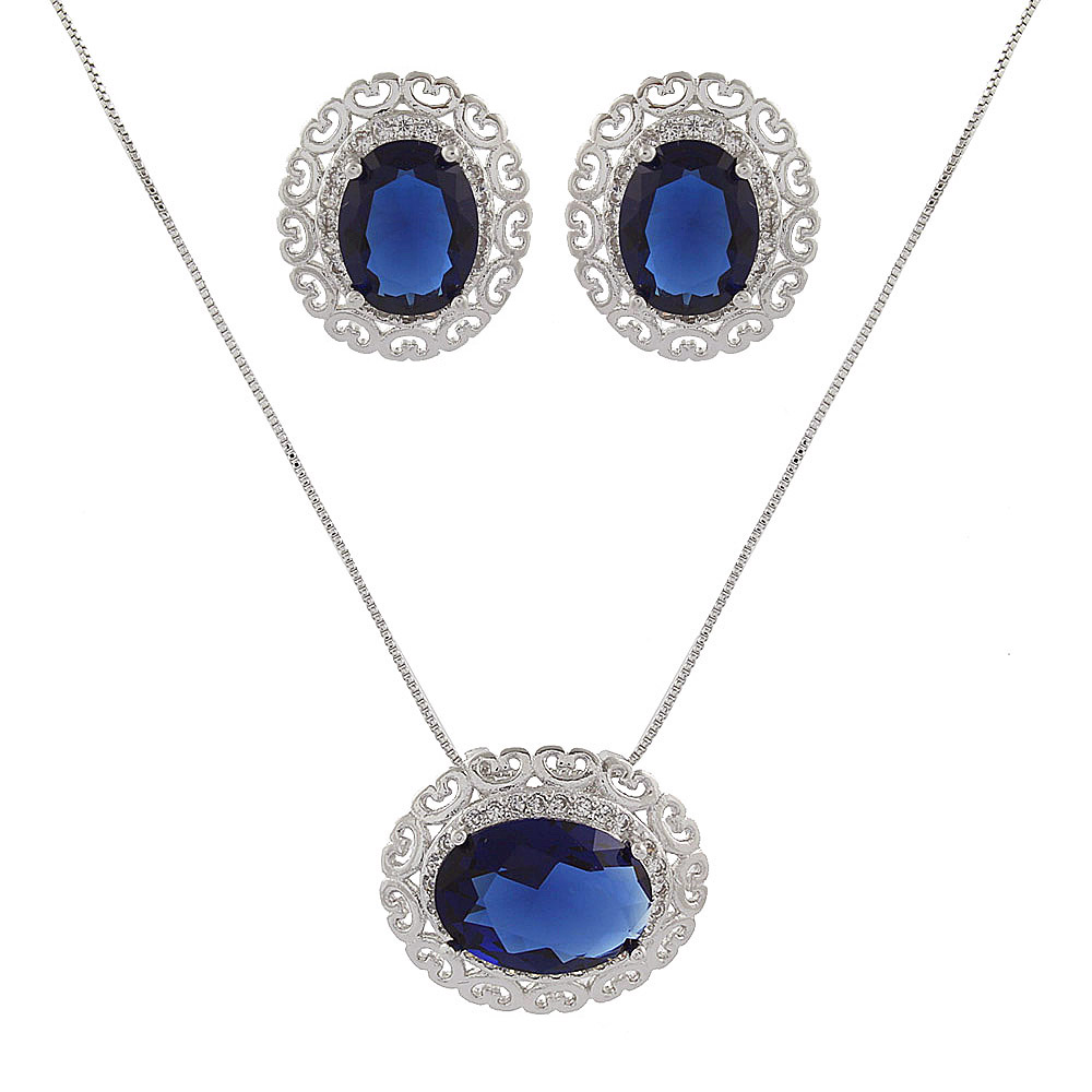 Conjunto colar + brinco em zircônia e pedras naturais banhado a ródio branco